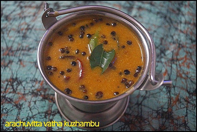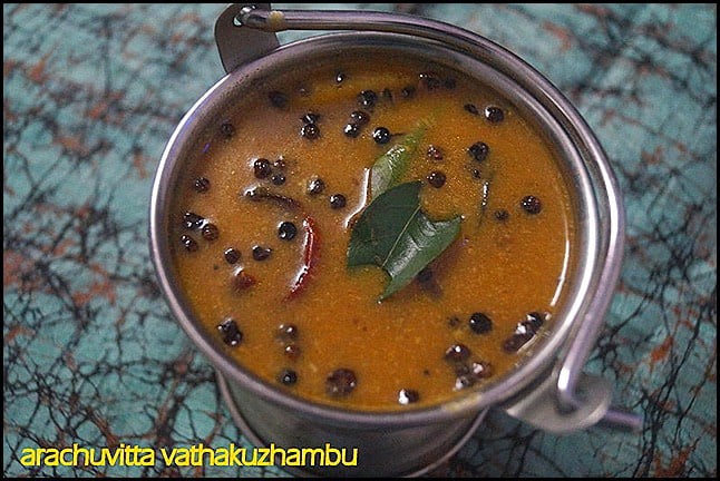 It was in a relative’s wedding lunch menu I tasted this Arachuvitta Vathakuzhambu.Needless to say it was tasty, but it was kind of thicker as a paste and when asked it what is was,t he catering people told, it was a side dish for curd rice and it has some blended spices roasted and ground and added to the gravy.I did not have any idea of Arachutta Vathakuzhambu,I knew only Arachuvitta Sambhar.This one sounded unique and immediately after 2 days I tried it in my kitchen.I kept the gravy not too thick, as we wanted the gravy to go with rice.You may follow the same proceedure or might thicken the gravy as you want.I have used Manathakkali Vathal for this, you may use Sundakkai Vathal also.Now to the recipe..