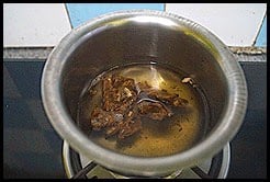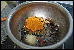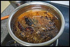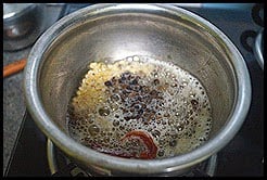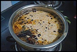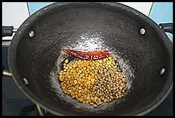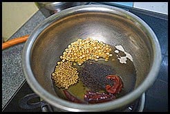 - In a heavy bottomed pan add sesame oil.Add in order mustard,methi,tur dal,red chilli and asafoetida.