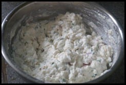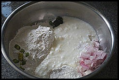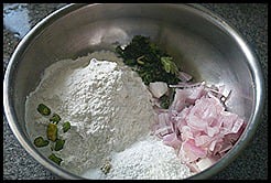 - Add maida,rice flour,jeera ,salt,chopped green chilles,curry and coriander leaves along with chopped onions in a big vessel.
