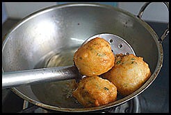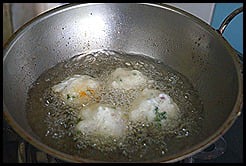 - Heat oil in a kadai and slowly drop in balls of the batter as shown.
