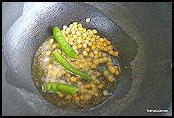 - In a kadai pour oil and when it gets heated add mustard, channa dal slit green chillies.