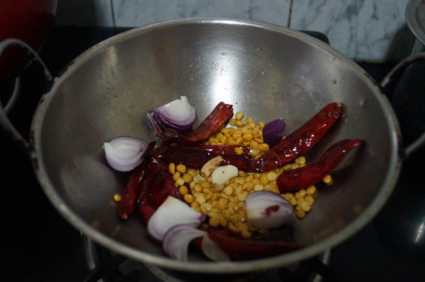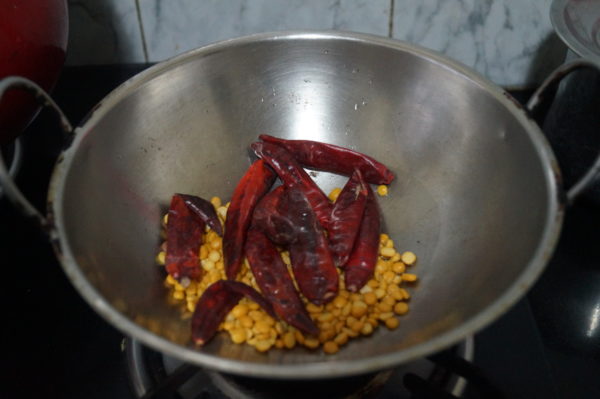 - In another pan add oil, mustard and channa dal along with curry leaves.